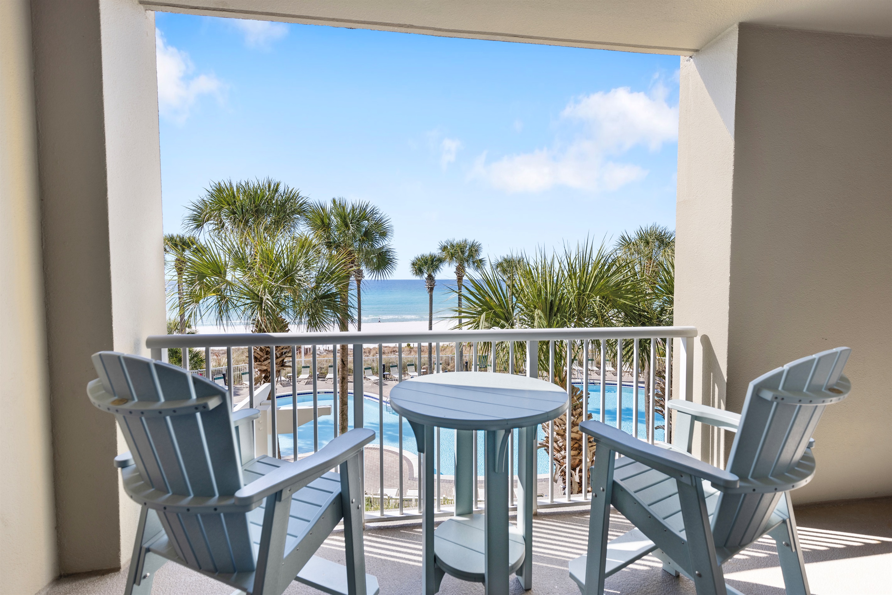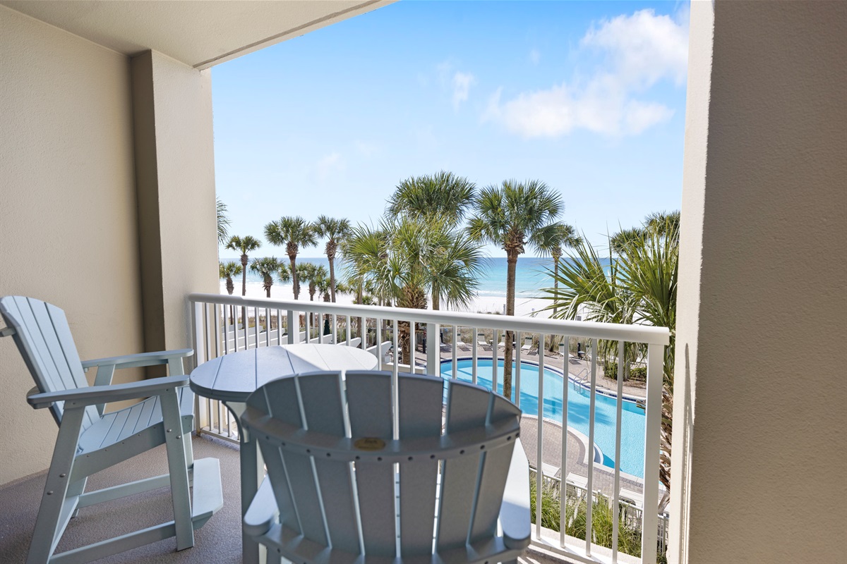 Spacious private balcony with panoramic views of the pool, sand, surf, and sunsets