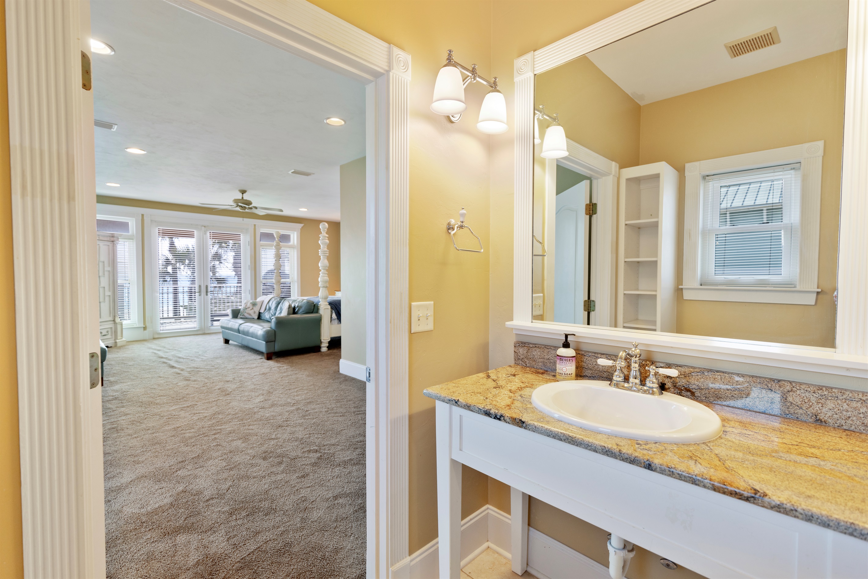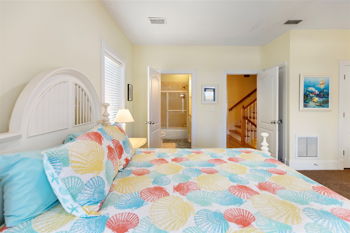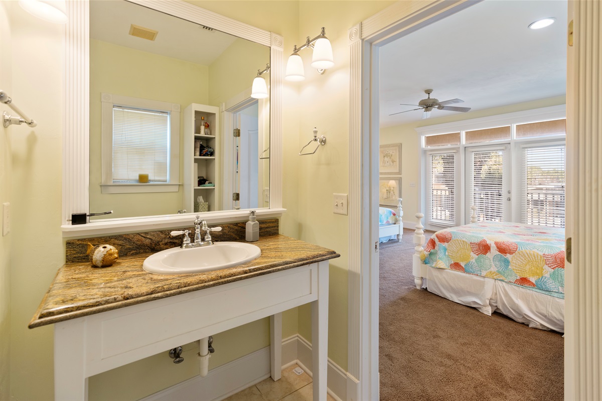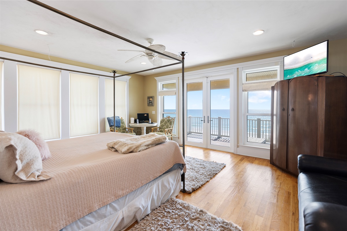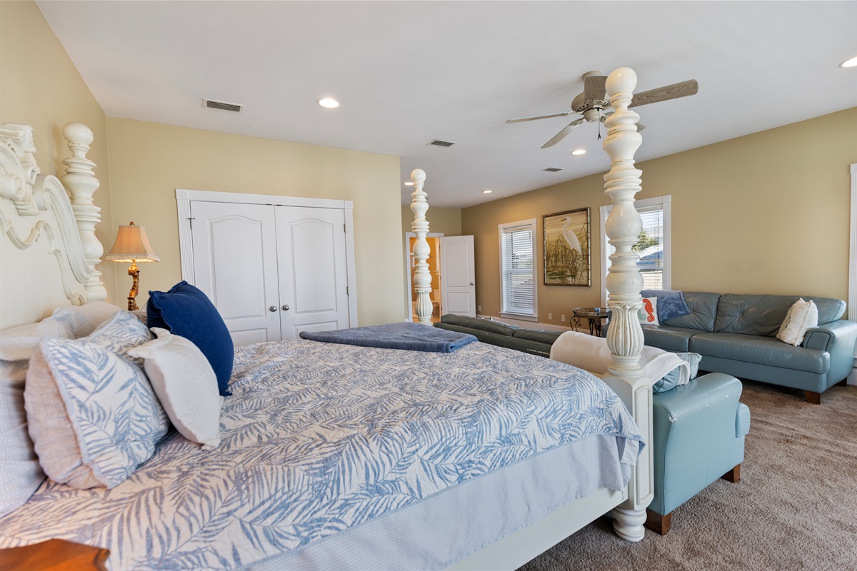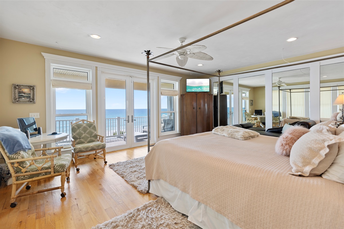 Second Floor Bedroom: King bed, sitting area, elevator and balcony access