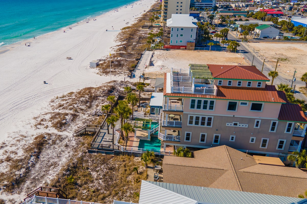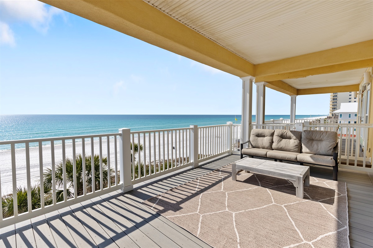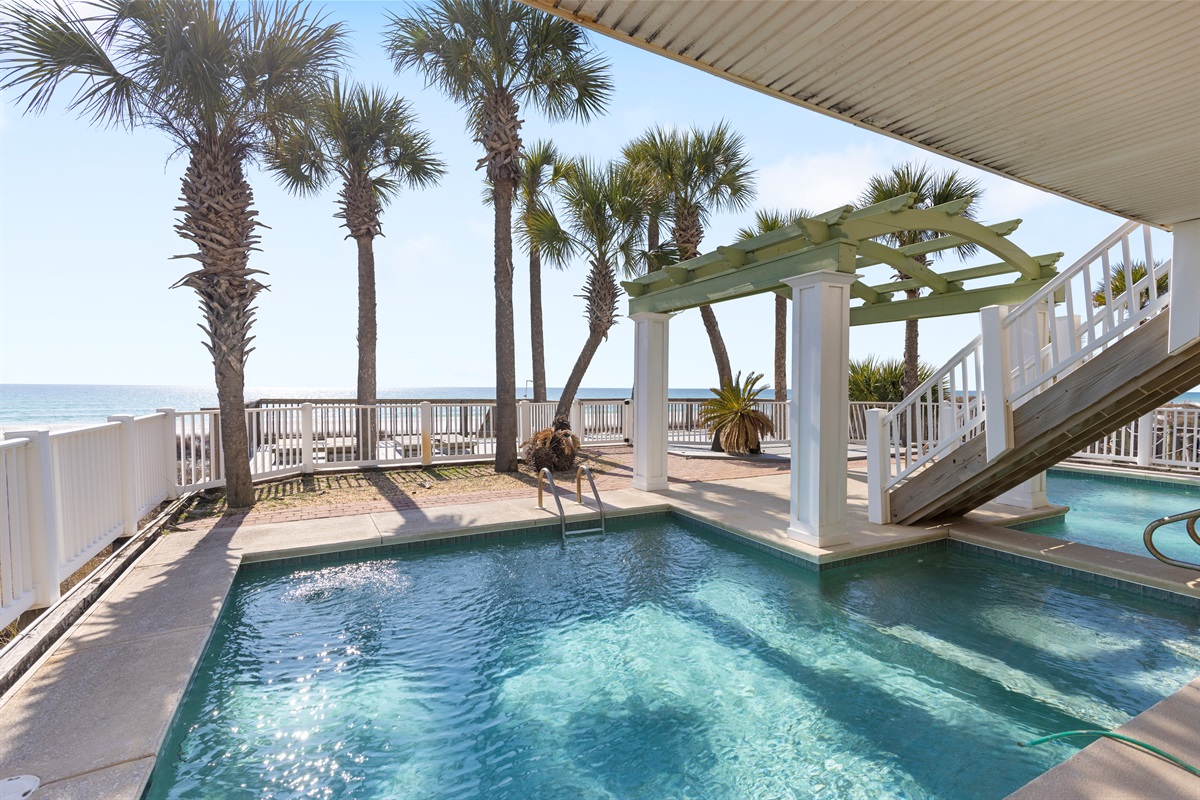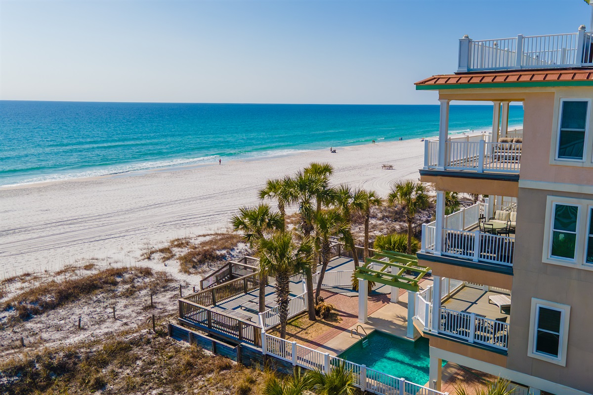 4 Bedrooms • 5 Bathrooms 5 Baths • Sleeps 8-16Welcome to New Day — a spectacular Gulf-front townhome where elevated design meets effortless beachfront living. This one-of-a-kind duplex style retreat offers direct beach access, a private beachfront pool, and sweeping panoramic views of the emerald Gulf, creating an unforgettable setting for coastal escapes and memorable gatherings. Thoughtfully designed for both relaxation and entertaining, the home features a chef-inspired gourmet kitchen, and a wet bar with ice maker, making it easy to host family and friends. Multiple balconies overlook the private pool and open directly to the sugar-white sands of Panama City Beach, blurring the line between indoor comfort and outdoor beauty.