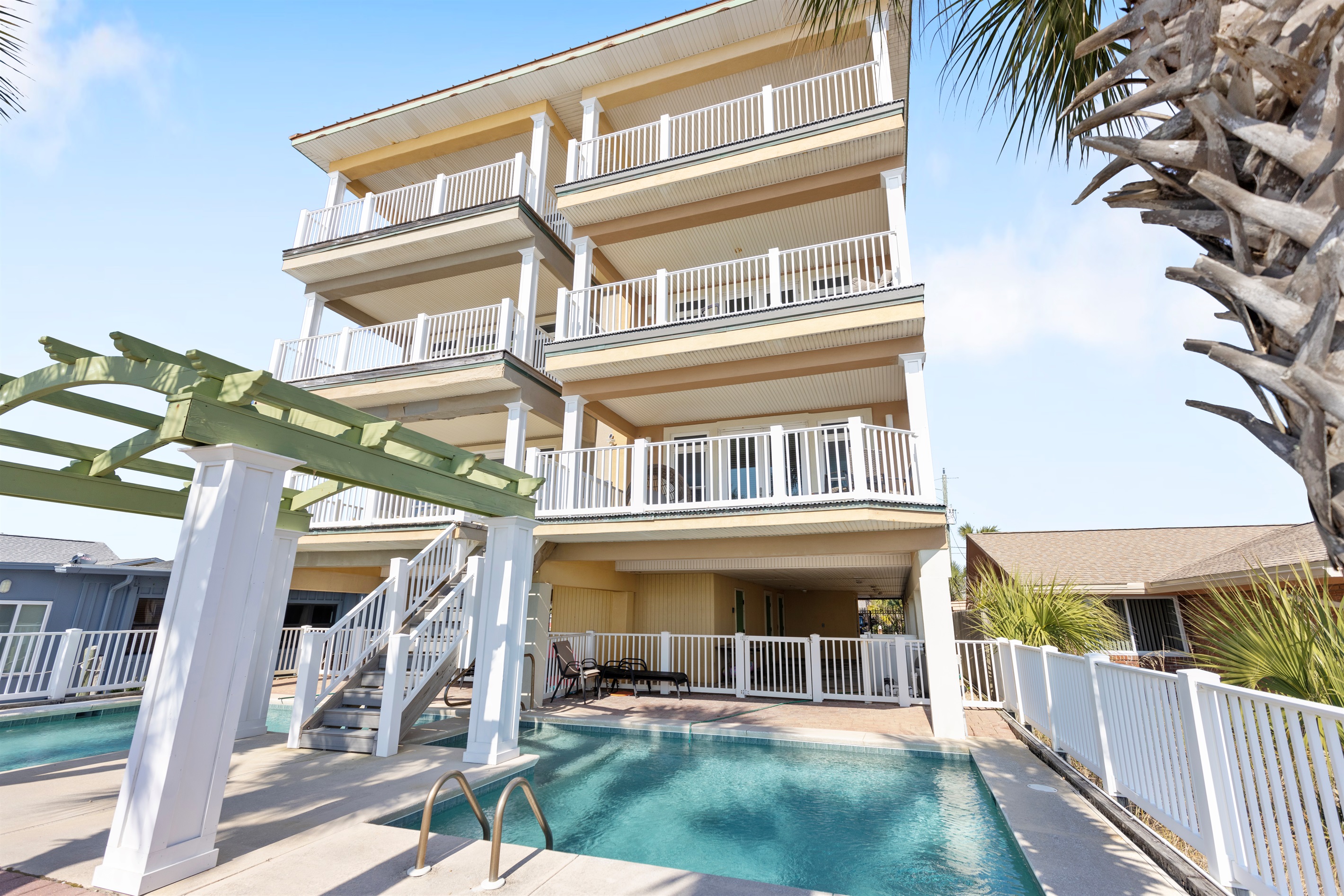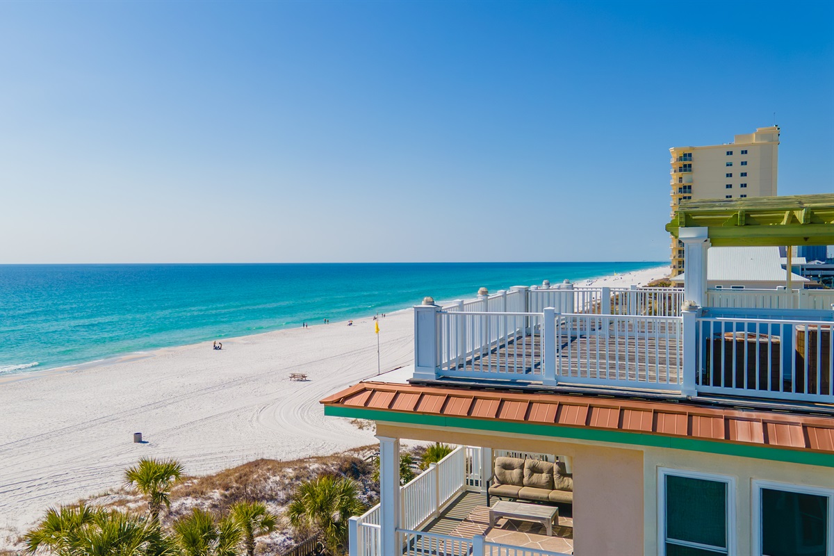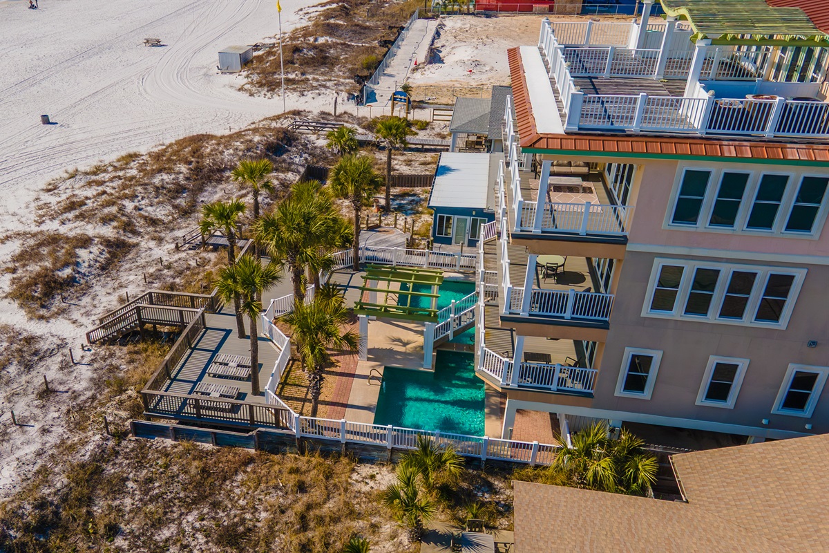 4 Bedrooms • 5 Bathrooms 5 Baths • Sleeps 8-16Welcome to New Day — a spectacular Gulf-front townhome where elevated design meets effortless beachfront living. This one-of-a-kind duplex style retreat offers direct beach access, a private beachfront pool, and sweeping panoramic views of the emerald Gulf, creating an unforgettable setting for coastal escapes and memorable gatherings. Thoughtfully designed for both relaxation and entertaining, the home features a chef-inspired gourmet kitchen, and a wet bar with ice maker, making it easy to host family and friends. Multiple balconies overlook the private pool and open directly to the sugar-white sands of Panama City Beach, blurring the line between indoor comfort and outdoor beauty.