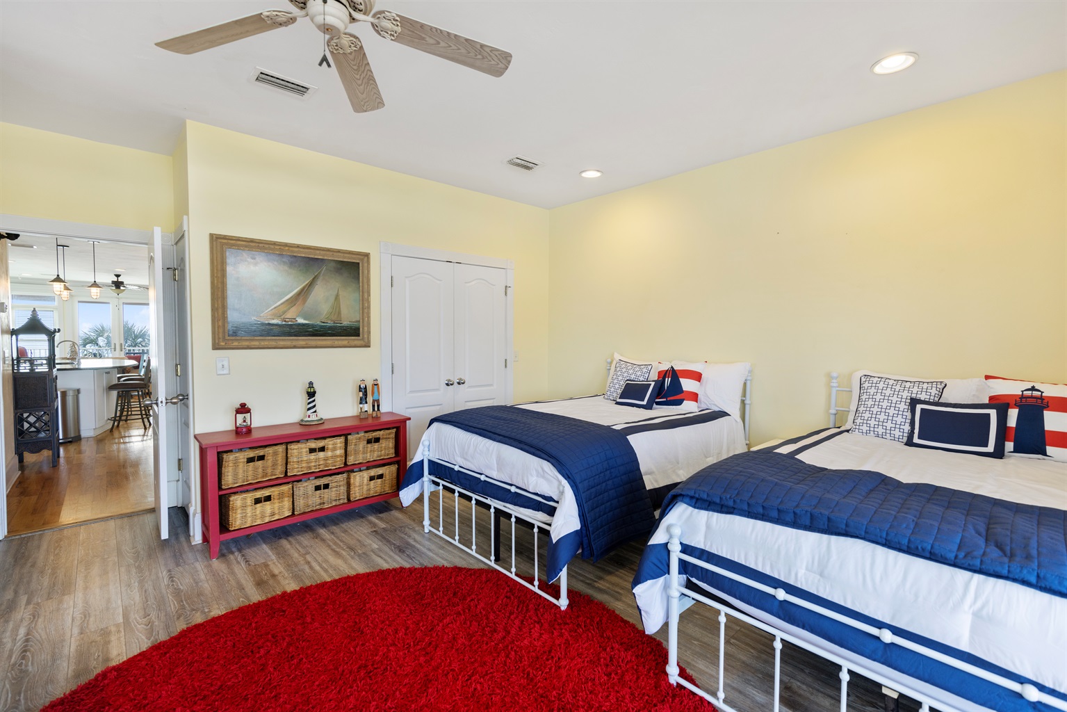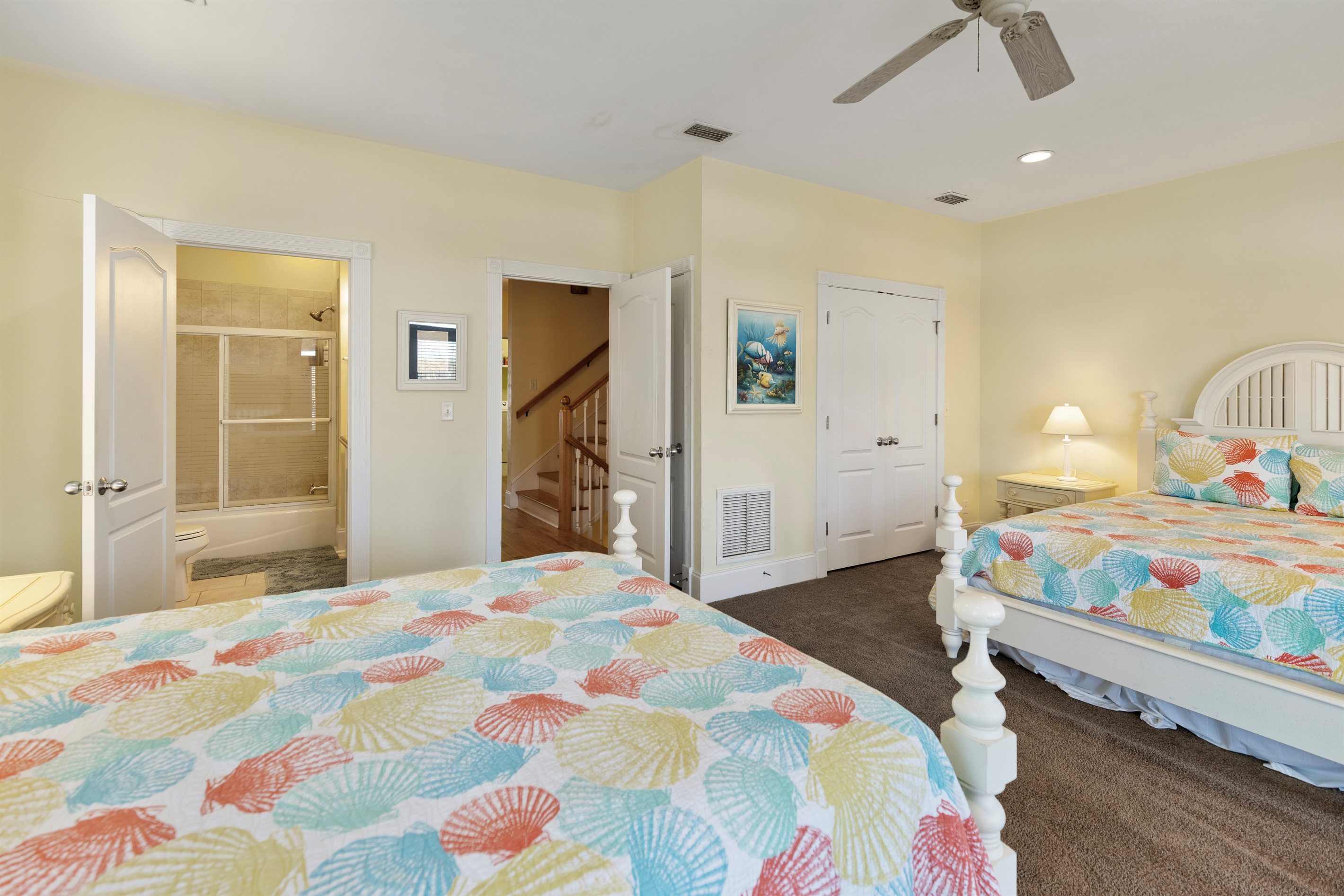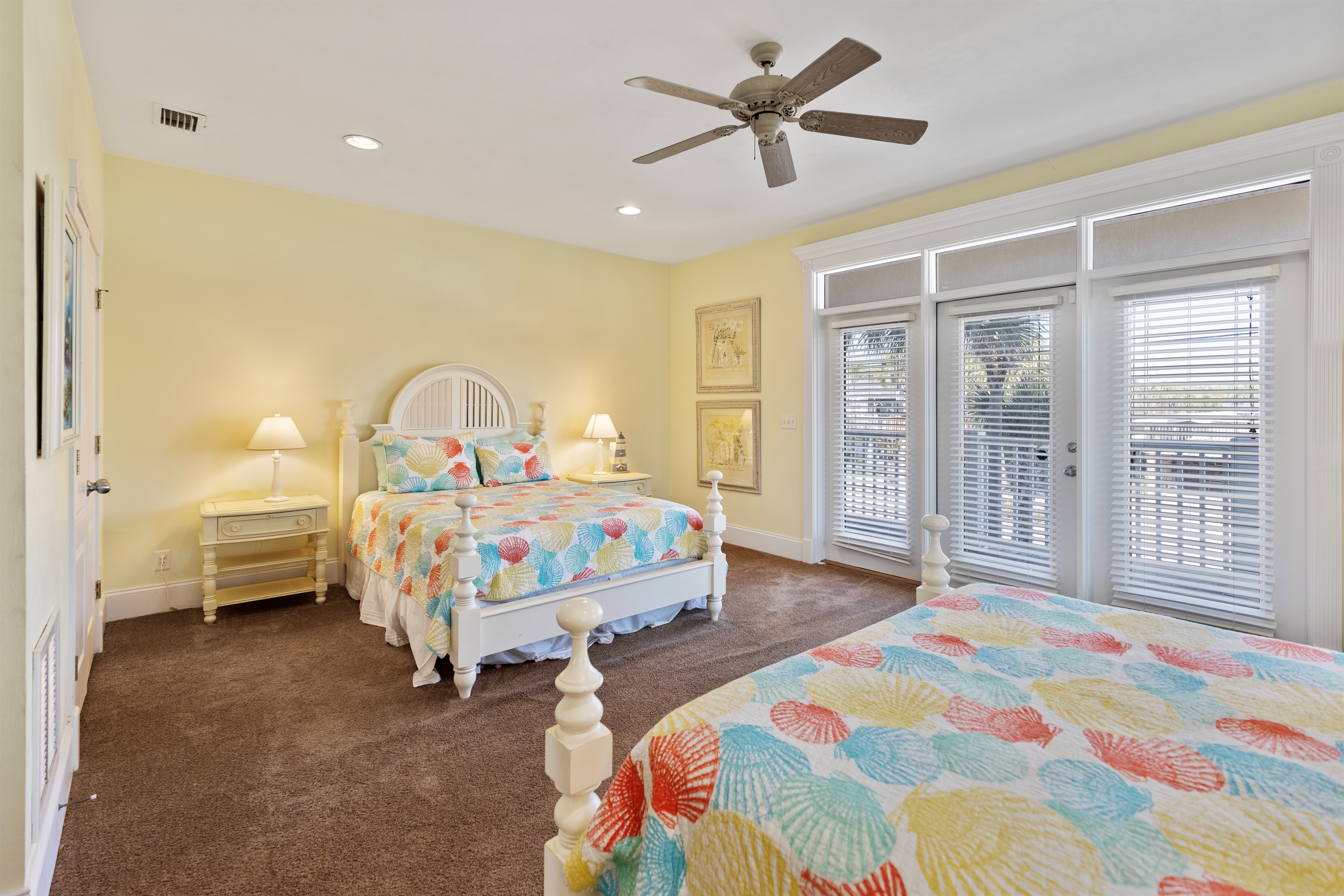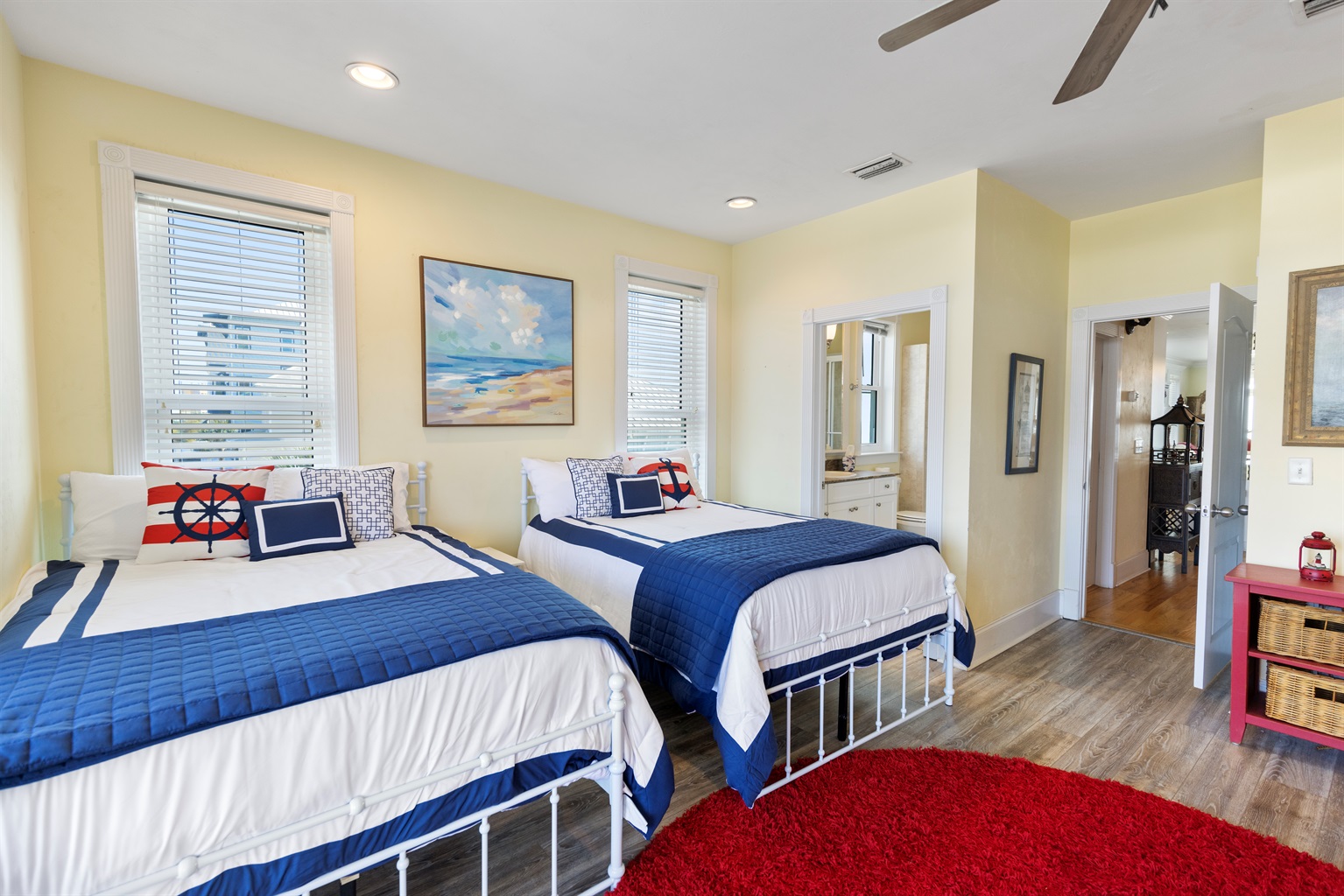 Second Floor Bedroom: Two queen beds, street views, balcony access