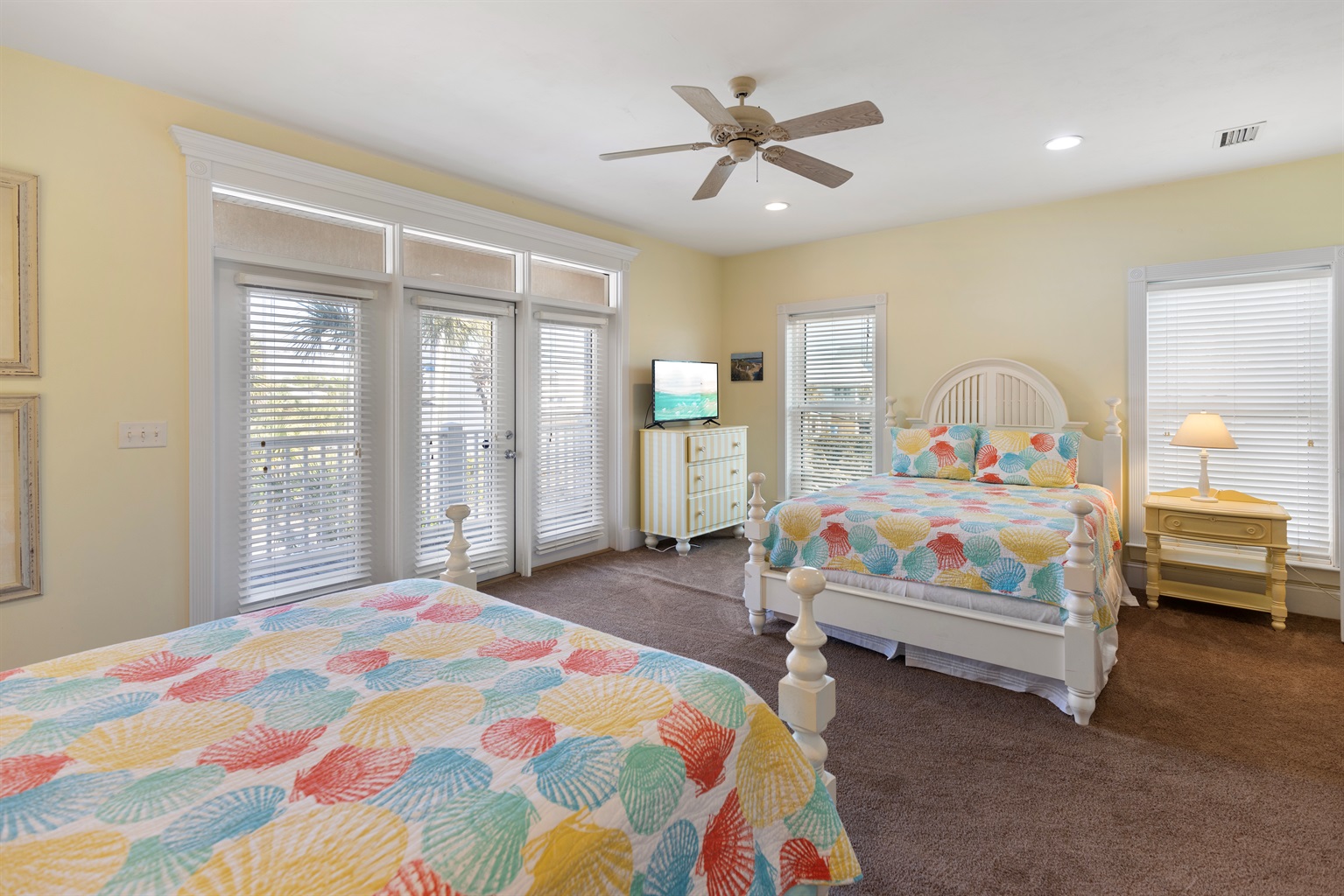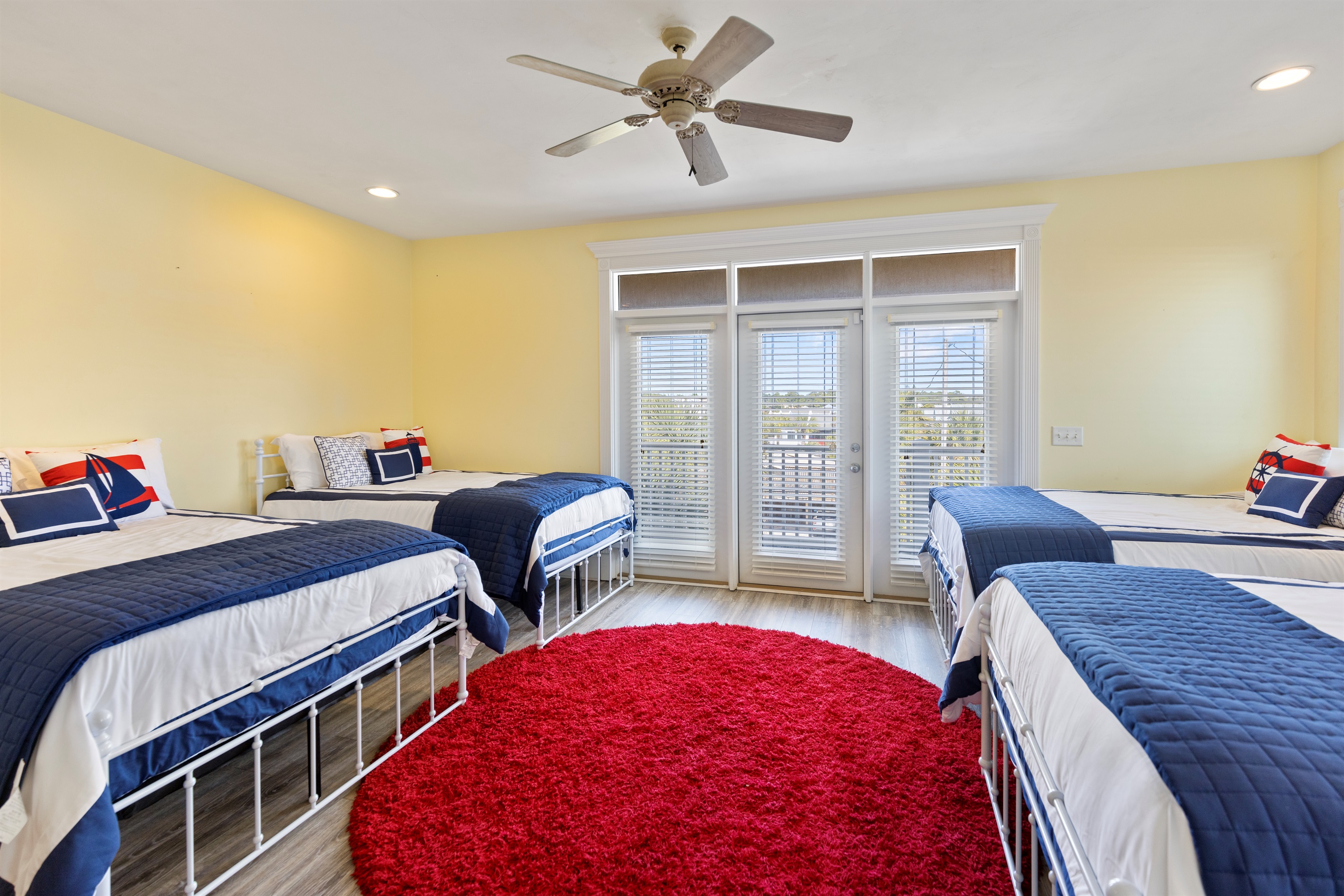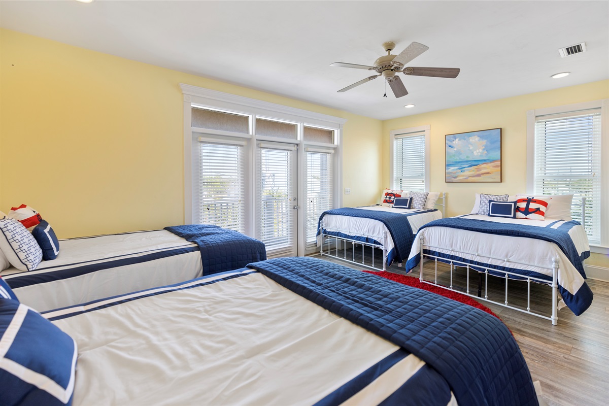 Third Floor Bedroom: Four queen beds, street views, balcony access